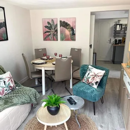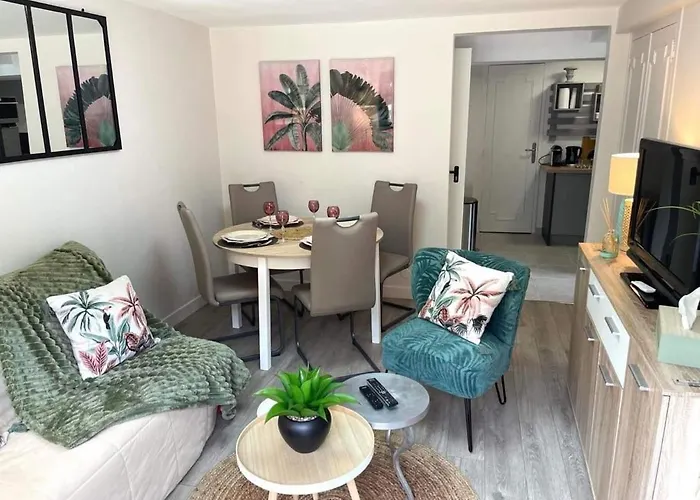 Gite L'Oree Deauvillaise 5 Minutes Deauvilletrouville appartement heeft een ingerichte keuken uitgerust met een oven en een vaatwasser ter beschikking van de gasten. Het appartement ligt op 10 minuten rijden van Deauville-Normandie luchthaven. Het appartement heeft een terras met de tuin.